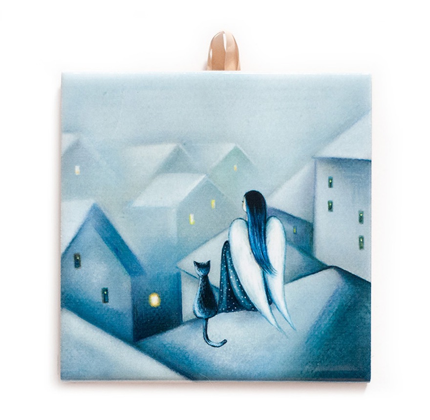 Angel and Cat on the Rooftops – Ceramic Tile with Cork Backing | Dreamy Night Art4″x4″ #N-07Above the city He sat quietly on the roof, He looked at the city, surprised by what he saw… He thought… sometimes you have to change the perspective to see the meaning…