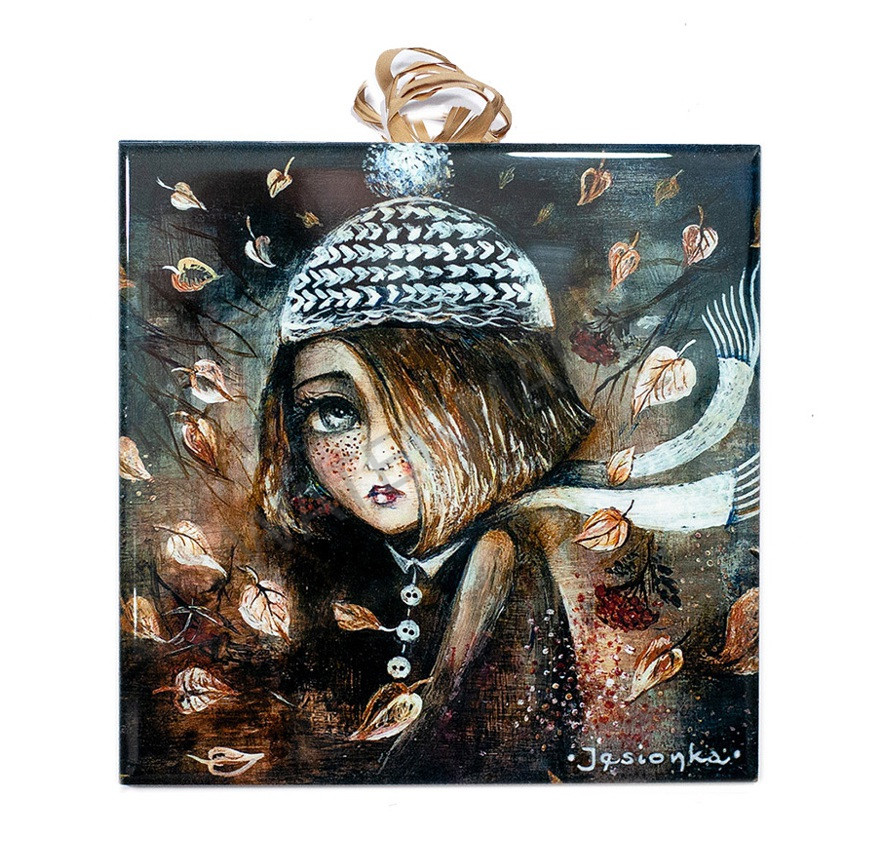 This atmospheric ceramic tile captures the beauty and melancholy of autumn through the portrait of a whimsical girl with large, expressive eyes. Dressed in a cozy knitted hat and scarf, she gazes softly as golden leaves swirl all around her, carried by the autumn wind. The rich earthy tones and painterly textures bring warmth and depth to this captivating artwork.
