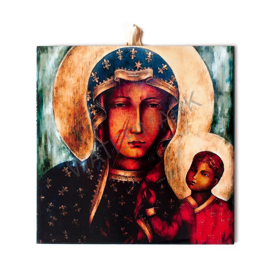 This beautiful religious icon, painted on a ceramic tile depicts the Black Madonna of Częstochowa, one of the most revered images of the Virgin Mary in Christian tradition. Known for her deep, compassionate gaze and protective presence, the Virgin is shown holding the Christ Child, both adorned with golden halos. The dark tones of Mary’s face contrast beautifully with the rich colors of her robe and the child’s garments, symbolizing strength, endurance, and divine love.