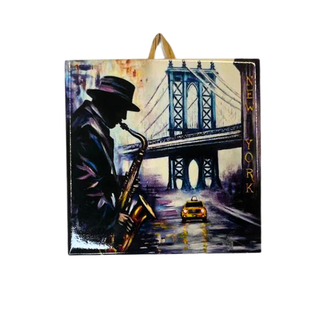 Made from durable ceramic with a glossy finish, the tile showcases deep colors and expressive detail. It works beautifully as a decorative wall tile, framed accent piece, shelf display, or a bold insert in a backsplash or art wall. A perfect choice for lovers of New York, jazz culture, and expressive urban art.