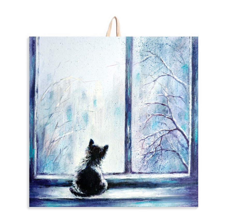 This charming ceramic tile features a touching painting of a cat sitting on a windowsill, gazing out at a serene winter scene. The delicate shades of blue, white, and soft purple capture the calm and quiet beauty of snowy days, creating a cozy and reflective atmosphere. Perfect for cat lovers and admirers of tranquil art, this piece adds warmth and character to any space. The ceramic tile is backed with cork, making it safe for hanging without damaging the wall. It includes a built-in hook for easy mounting and can also be displayed on a stand, allowing it to serve beautifully as either a wall decoration or a shelf ornament.