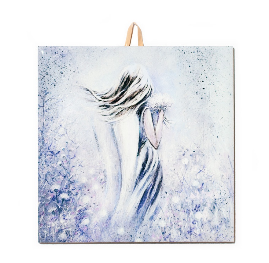 This delicate ceramic tile features a graceful angel in flowing white garments, holding a small bouquet of flowers while standing amidst a dreamy, lavender-tinted field. With her hair and robe softly blending into the misty background, the artwork radiates peace, purity, and transcendence. Shades of white, violet, and soft blue create an atmosphere of serenity and hope, making this tile a truly calming decorative piece.