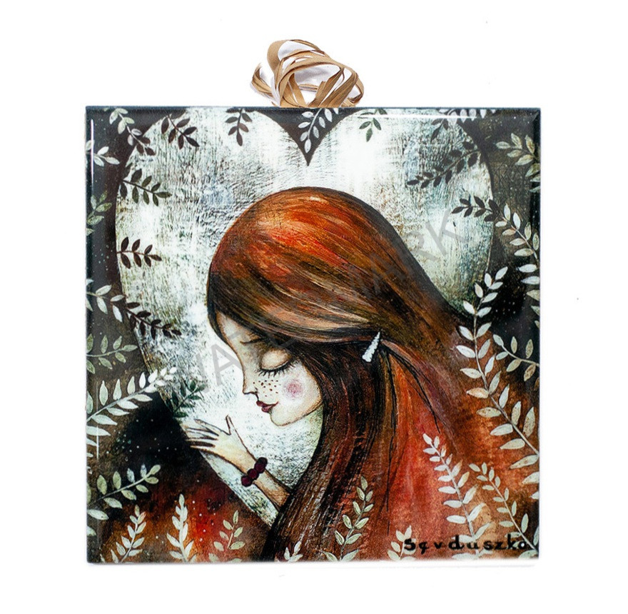 This charming ceramic tile captures a poetic moment of peace and tenderness. A girl with flowing auburn hair, eyes gently closed, rests against a large glowing heart surrounded by leafy branches. The warm, earthy colors and delicate brushstrokes create an atmosphere of calm, love, and reflection.