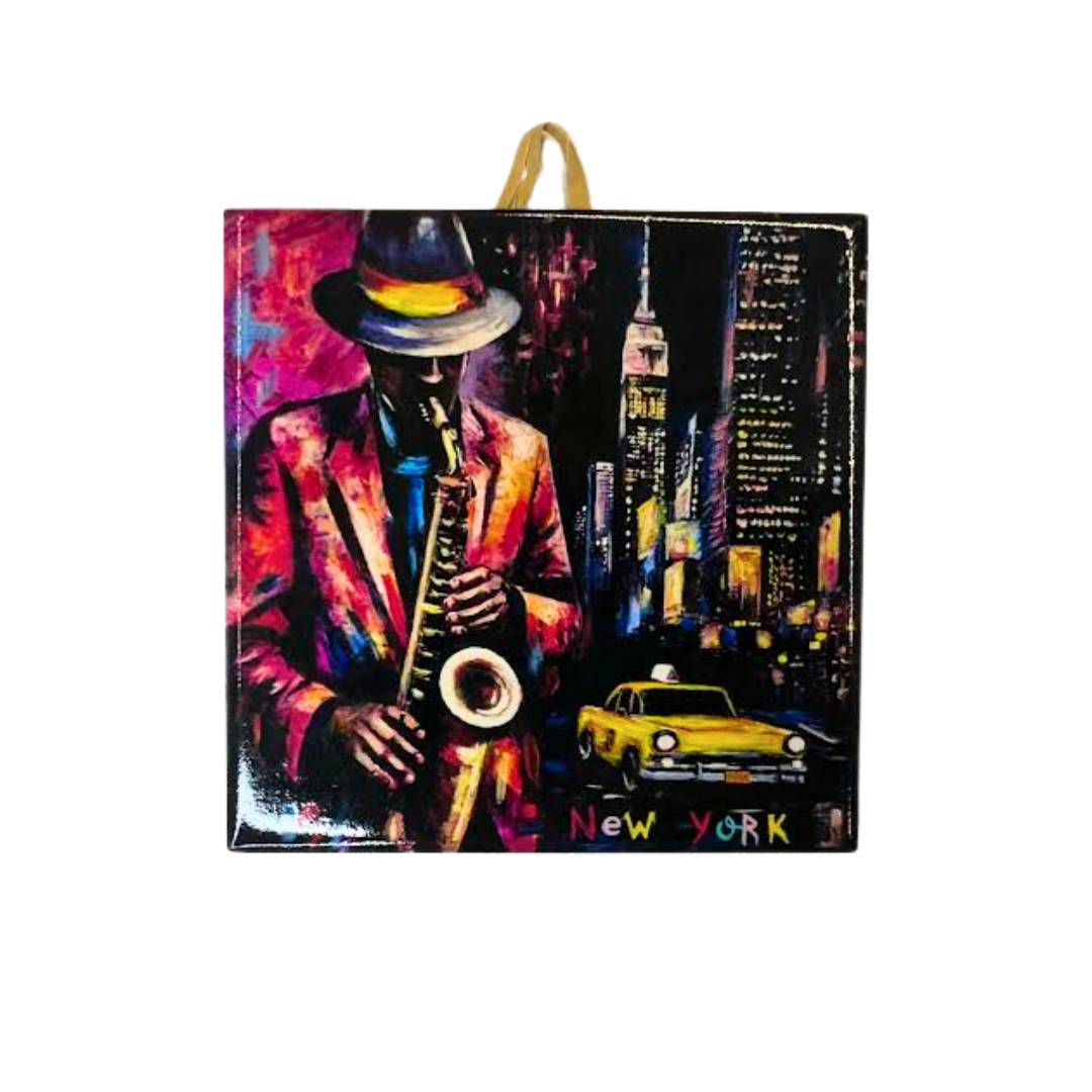 Made from durable ceramic with a glossy finish, the tile showcases deep colors and expressive detail. It works beautifully as a decorative wall tile, framed accent piece, shelf display, or a bold insert in a backsplash or art wall. A perfect choice for lovers of New York, jazz culture, and expressive urban art.
