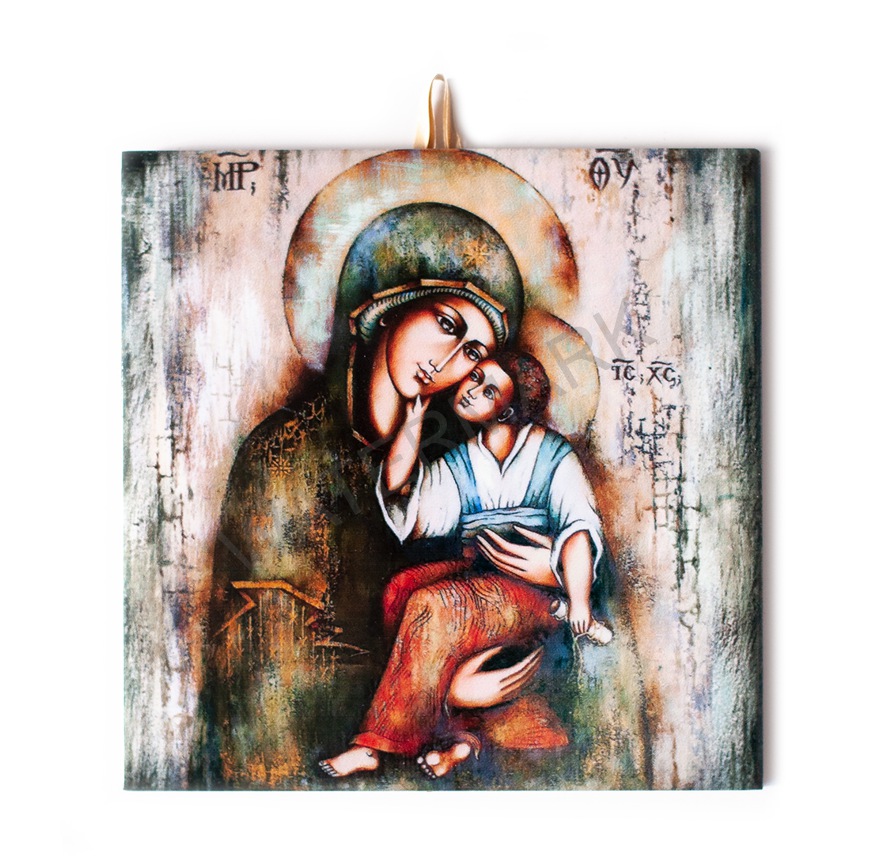 This exquisite, beautiful religious icon, painted on a ceramic tiledepicts the Virgin Mary tenderly holding the Christ Child in a warm embrace. Created in the Byzantine tradition, the artwork features luminous halos, intricate details, and soft earthy tones that highlight the sacred bond between mother and son. The Greek inscriptions further enhance its authenticity and spiritual depth, making it a cherished piece for prayer corners, churches, or as a meaningful gift for loved ones.