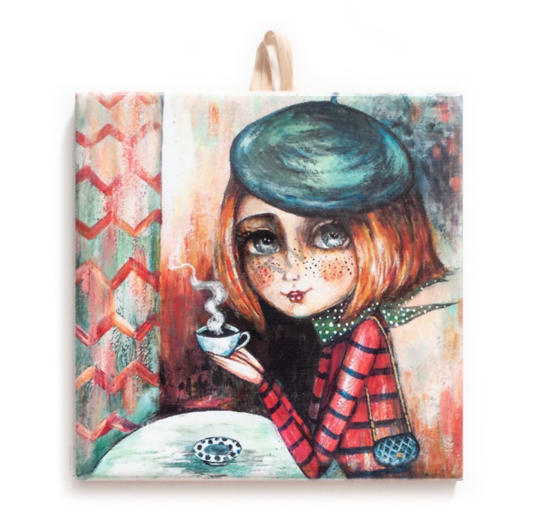 Add a splash of charm and character to your space with this vibrant ceramic tile artwork. Featuring a whimsical, wide-eyed girl with a freckled face, sipping coffee in a cozy café setting, this piece captures a moment of quiet reflection and Parisian flair. Her red striped outfit, teal beret, and soft gaze add warmth and personality to any room.